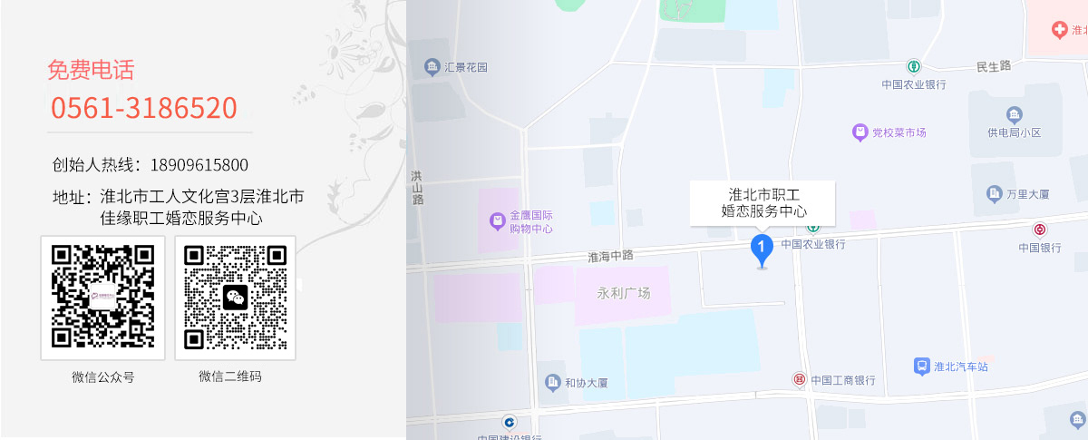 - 淮北市佳缘婚介服务有限公司是经市民政局批准、工商局注册成立,是“中国婚介行业服务标准执行单位”、“市消费者315诚信单位”,具有独立法人资格。是淮北市第一家敢于打破传统婚介理念且具有特色的婚恋机构,实现了“企业转型、产品升级、服务创新”的目标,凭借着良好的信誉和口碑,特色的服务,全新的婚恋理念,在众多婚介中脱颖而出! 淮北职工佳缘以“诚实守信铸就品牌,贴心服务编织未来”的朴素服务理念和独特的婚恋文化,经过精心培育,铸造了淮北婚恋服务的知名品牌。 淮北职工佳缘是您身边更好的幸福顾问专家。公司为广大客户提供“高端婚恋交友、婚姻家庭咨询、心理疏导服务、亲子关系教育、家庭情感分析、情侣分手挽回、婚姻情感挽救、婚礼管家服务、十二商课程培训”等全业务的服务产品,为您的恋爱、婚姻、家庭和情感需求提供更贴心的管家式、更科学的专家式融合服务。